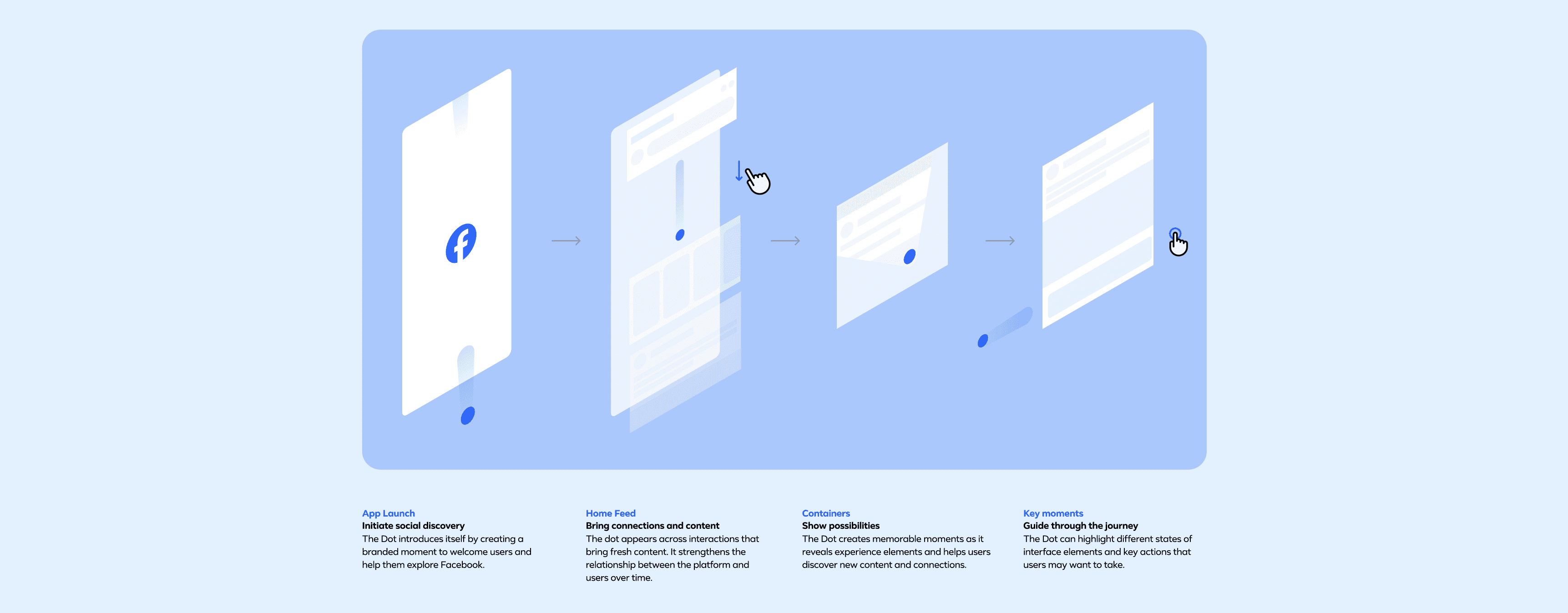 Concept: We worked closely with Facebook Design and Product leads to incorporate a new presence into the Facebook Identity: The Dot. A living guide born from our refreshed FB logo, The Dot takes users through interactions and experiences in app and in advertising.