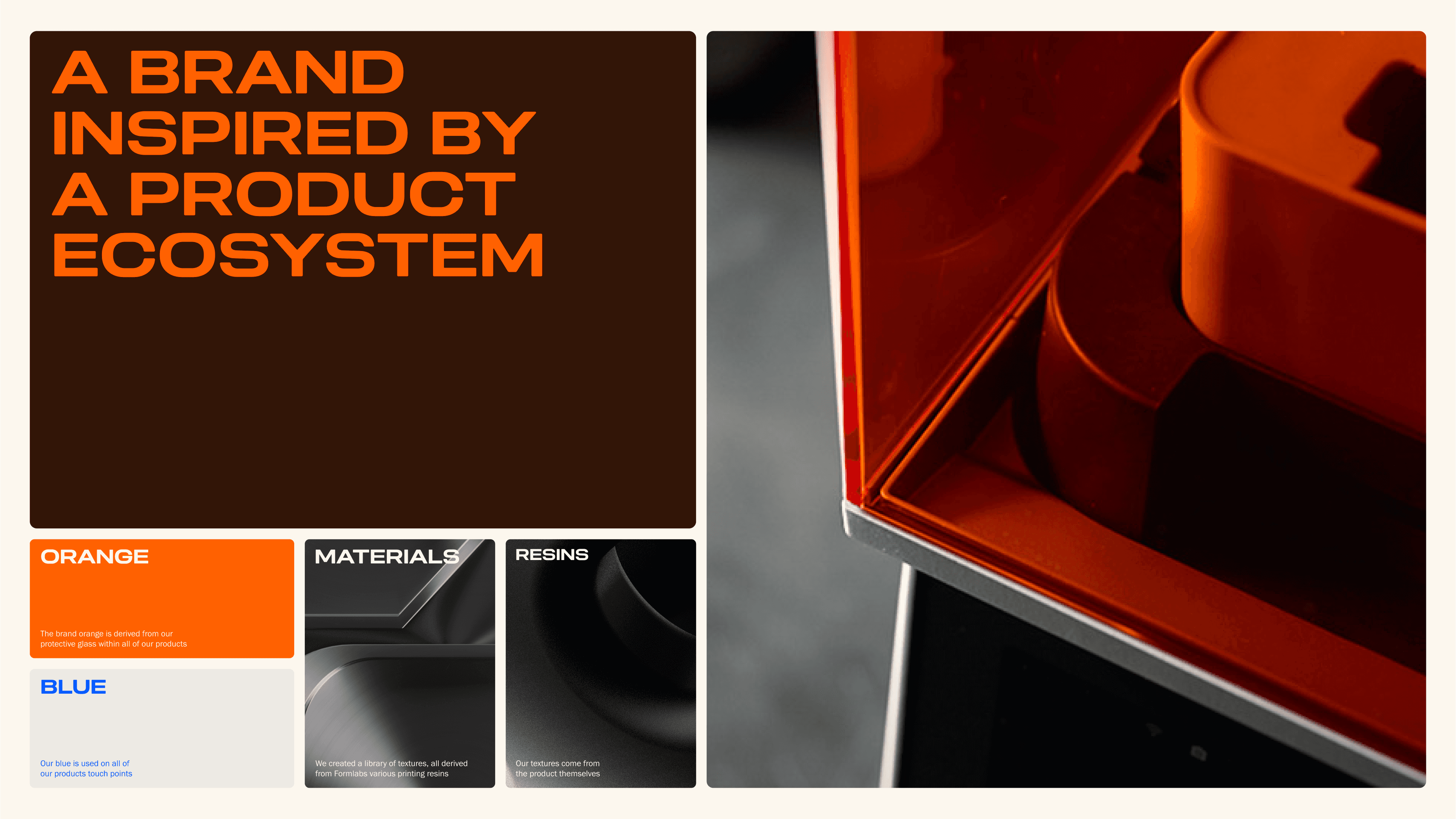 Concept: Formlabs’ brand felt disconnected from its intricate and sophisticated line of 3D printers. We pulled inspiration from their product design to build a brand system that included a more vibrant color palette, a sleek approach to product imagery, and bold typography. These changes ultimately made the brand more ownable through color, a simplified logo, and a more serious tone that aligns with their brand values.